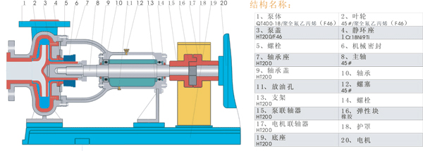 IHF型氟塑料化工离心泵为单级单吸离心泵,采用球墨铸铁作泵壳,涡室等过流内表面衬上一层5~6mm厚的聚全氟乙丙烯(F46),既有金属的强度又有内在耐苛刻腐蚀性介质的特性。叶轮采用带金属加强片连同短轴的一体化模压包衬聚全 氟乙丙烯(F46)而成。该材料耐腐蚀性能、耐温性能均高于普通工程塑料,俗称塑料"二王"其耐腐蚀性能、耐温性能同 聚四氟乙烯(F4)相似。